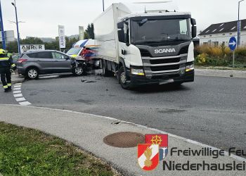 Zu einem Verkehrsunfall zwischen einem PKW und einen LKW wurde die Freiwillige Feuerwehr Niederhausleiten-Höfing am 14.Oktober in den Vormittagsstunden auf die B121, Kreisverkehr Haidhof gerufen.